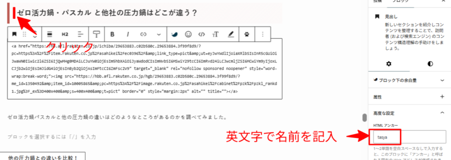まず、リンク先となる見出しやテキストにアンカーIDを設定します。
