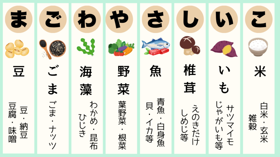 豆(ま)・ごま(ご)・わかめ(わ)・野菜(や)・魚(さ)・しいたけ(し)・いも(い)