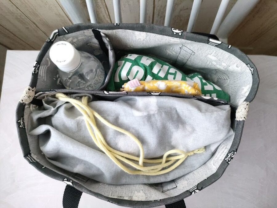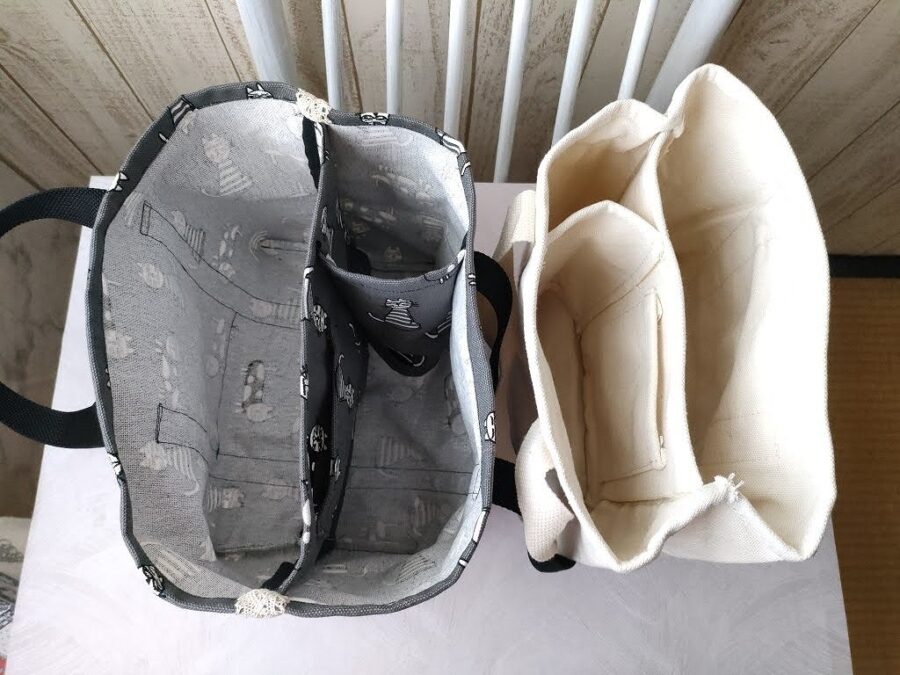 ダイソーで仕切り付きの手提げ袋があるので便利ですよ